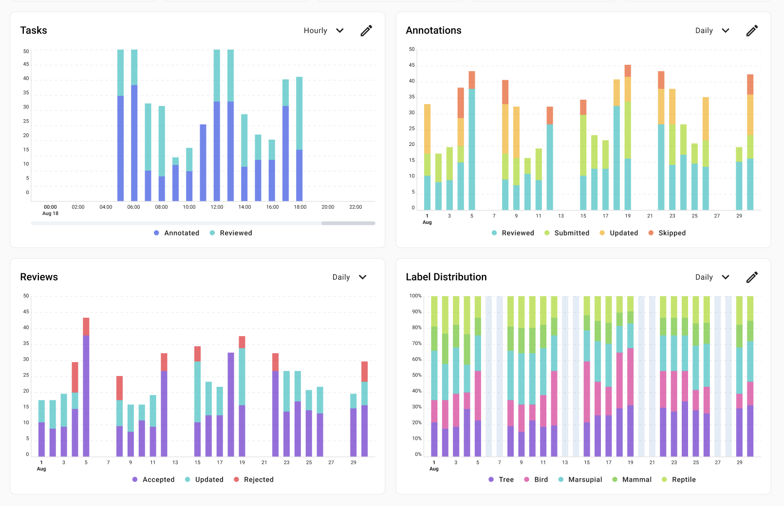 Manage project timelines, improve resource allocation, and update training and instructions to increase the efficiency of your dataset development initiatives. Administrators, organization owners, and workspace managers can access project performance dashboards to gain a better understanding of the team’s activity and progress against tasks, annotations, reviews, and labels for each project.