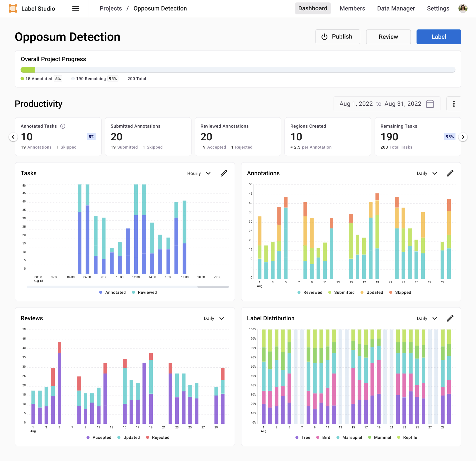 You can use the Label Studio Enterprise dashboards to help visualize your labeling progress across projects and resources.