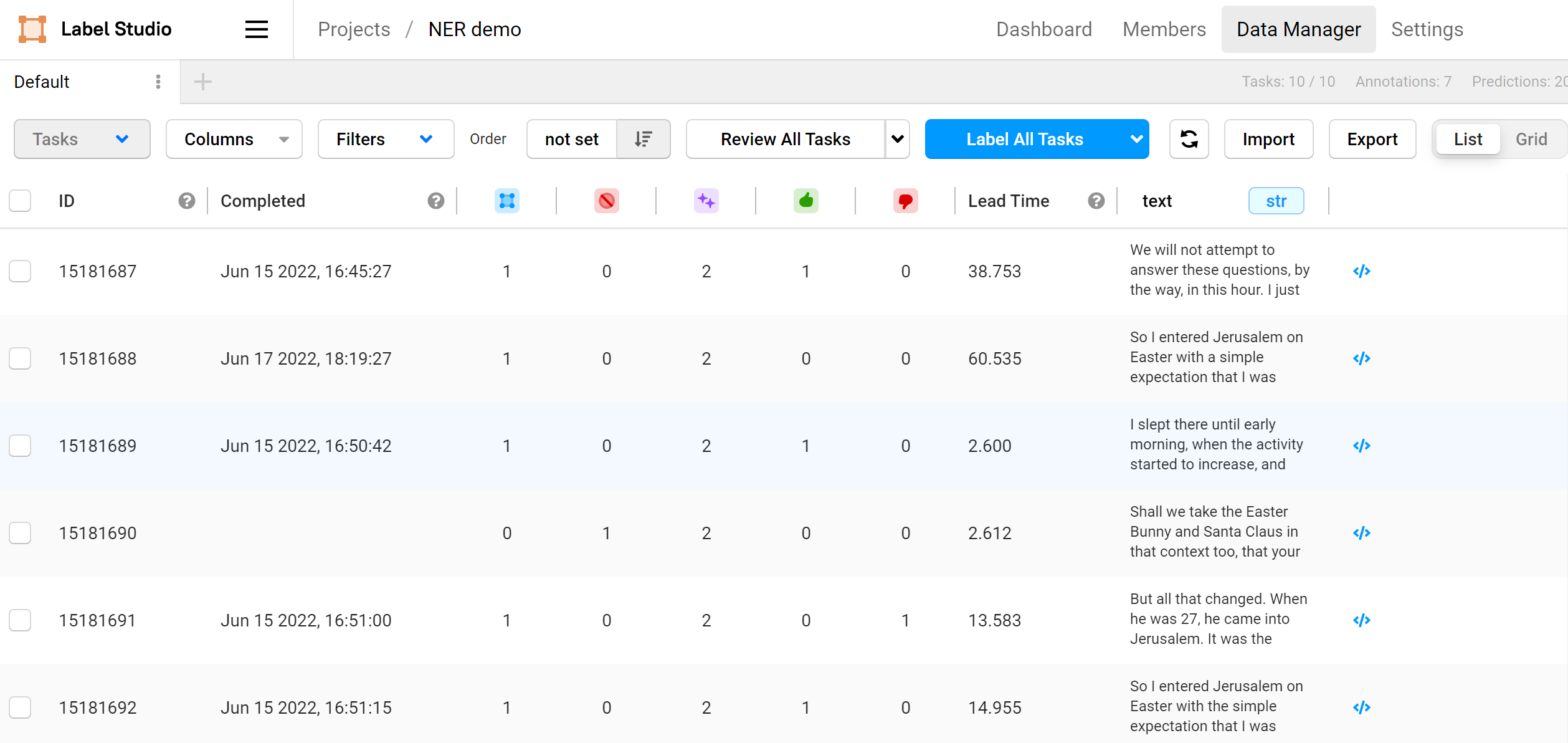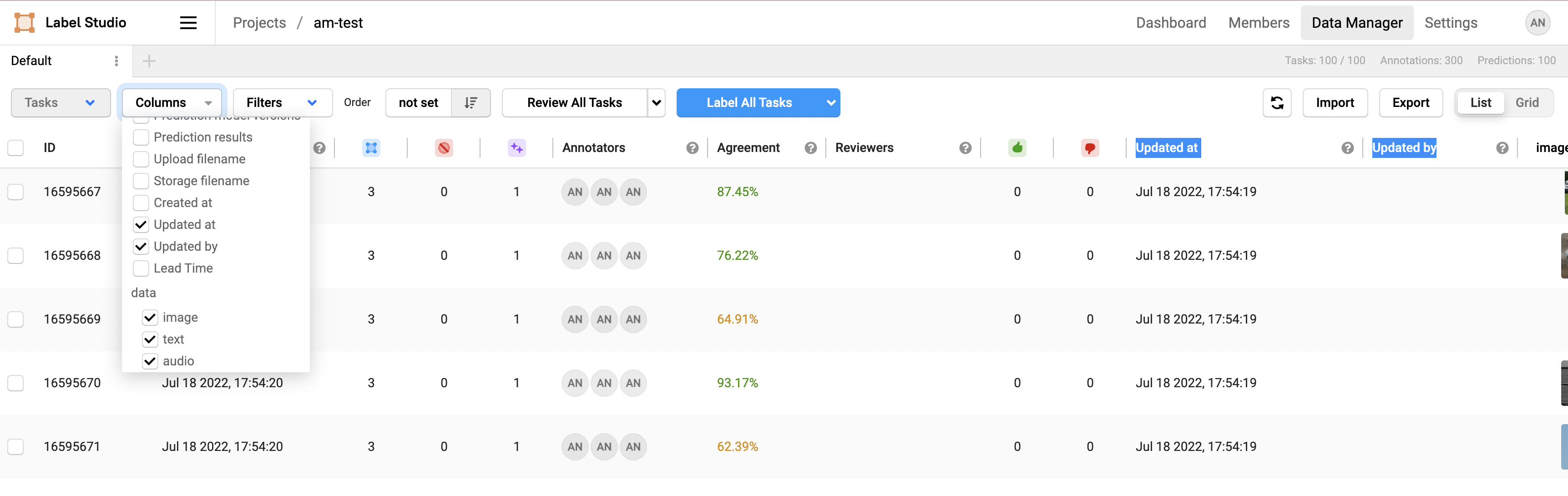 When using the View All action, users who are in the Reviewer role or higher can now see a summary of the annotations for a specific task. This summary includes metadata, agreements, and side-by-side comparisons of labels.