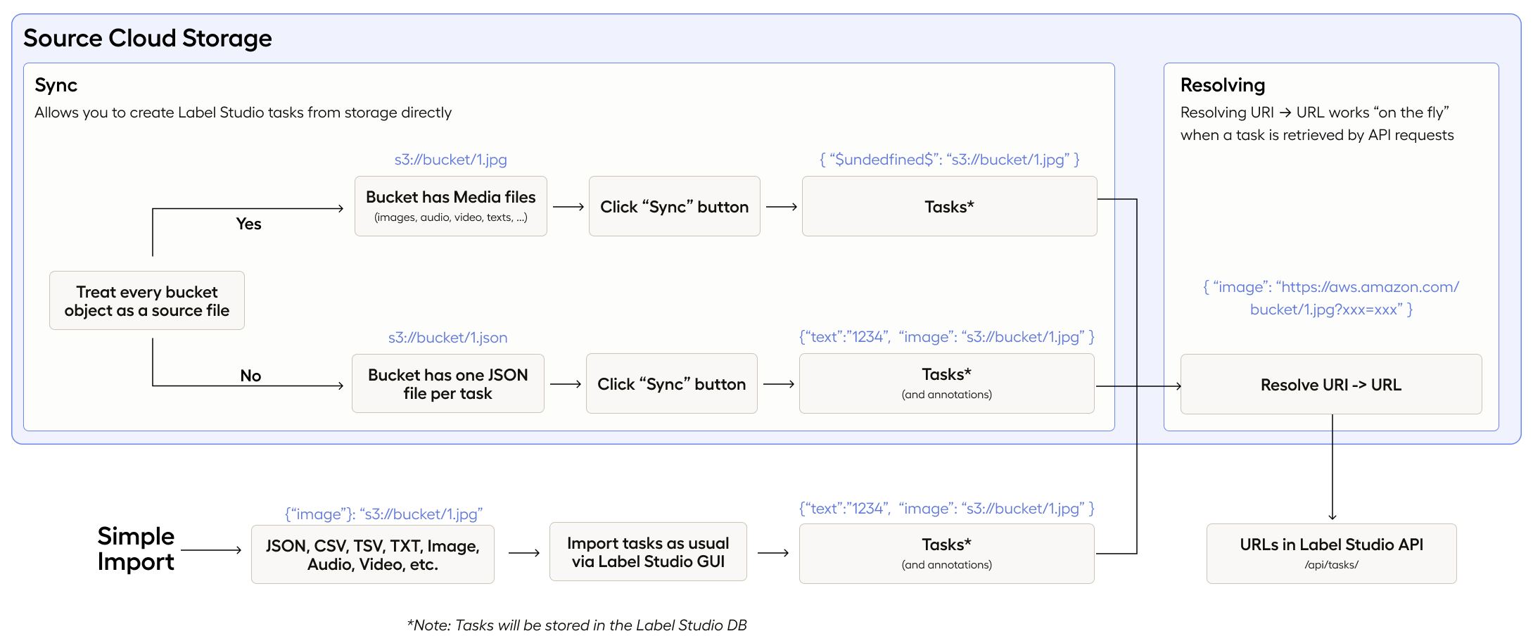 - When Tasks import method is selected, bucket files are assumed to be immutable; the only way to push an updated file’s state to Label Studio is to upload it with a new filename to storage or delete all tasks that are associated with that file and resync.